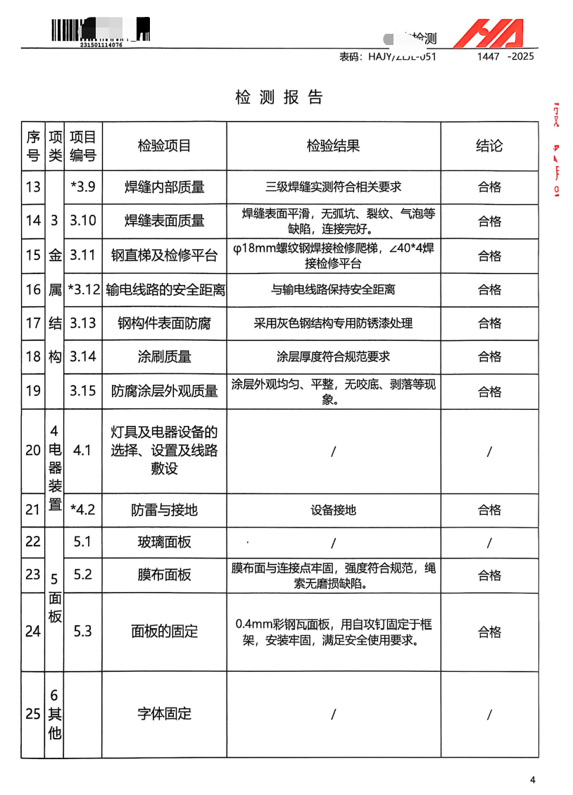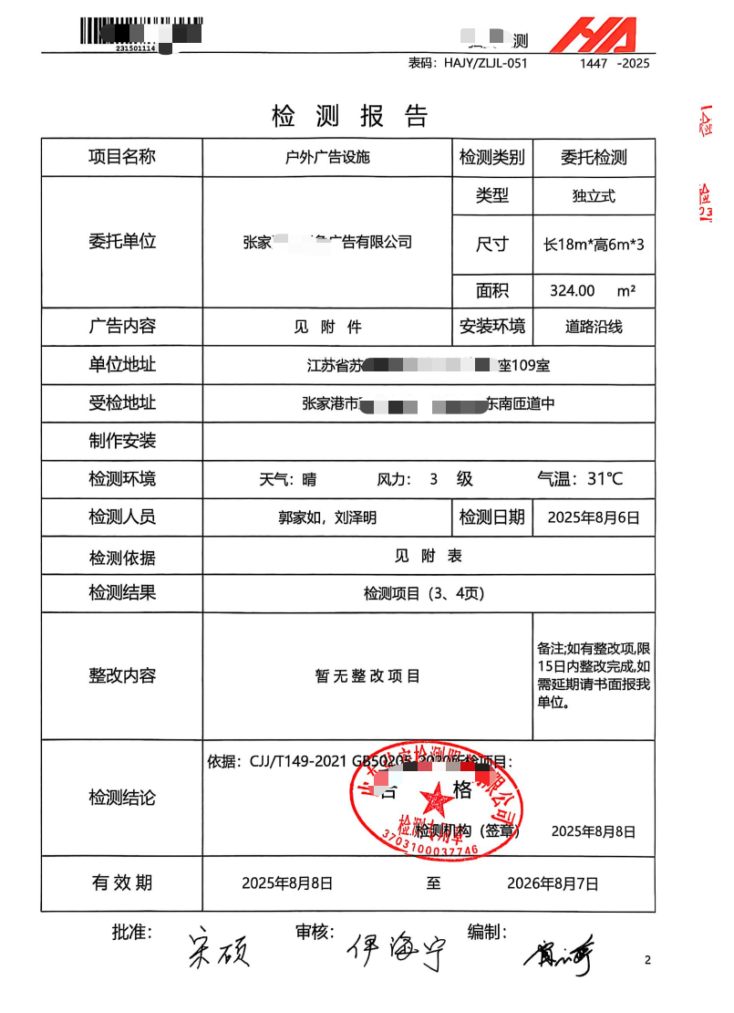 (2)專項(xiàng)檢測:遇臺風(fēng)、地震、暴雨等自然災(zāi)害后1個月內(nèi);結(jié)構(gòu)出現(xiàn)明顯變形、異響或部件脫落時;使用年限超過10年的廣告牌(需每半年1次)。